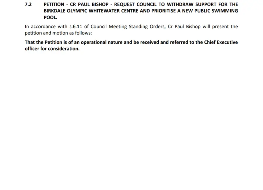 The issue came to prominence in relation to a petition due to be presented by Cr Paul Bishop, requesting Council withdraw support for the Birkdale Olympic Whitewater Centre and prioritise a new public swimming pool.