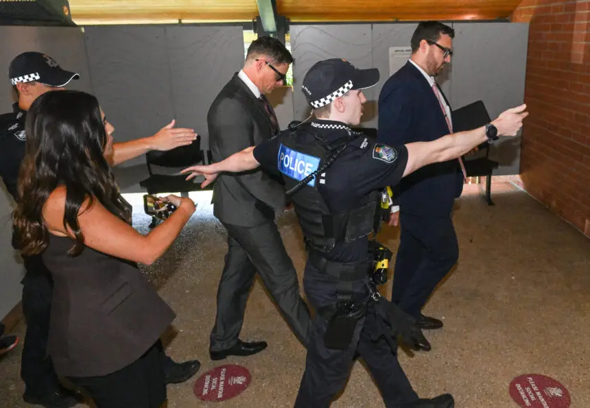 Nathan McKeown (centre) is seen being escorted by police into the Cleveland Magistrates Court, in Brisbane, Thursday, February 5, 2026. (AAP Image/Darren England) NO ARCHIVING