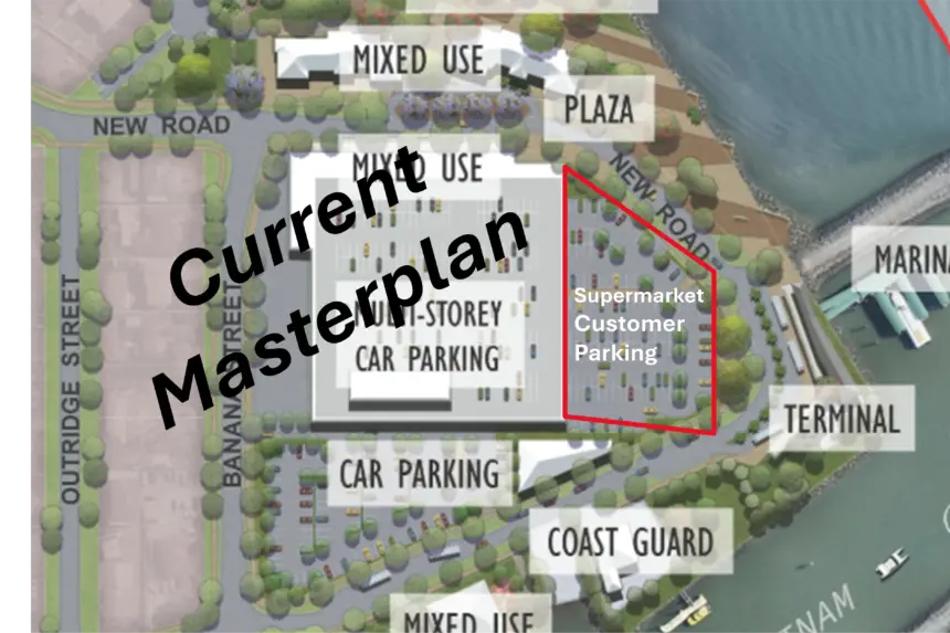 Under the Masterplan the existing car park to the west of the ferry terminal would become the car park for the full-line supermarket underlying the commercial proposition by the developer.